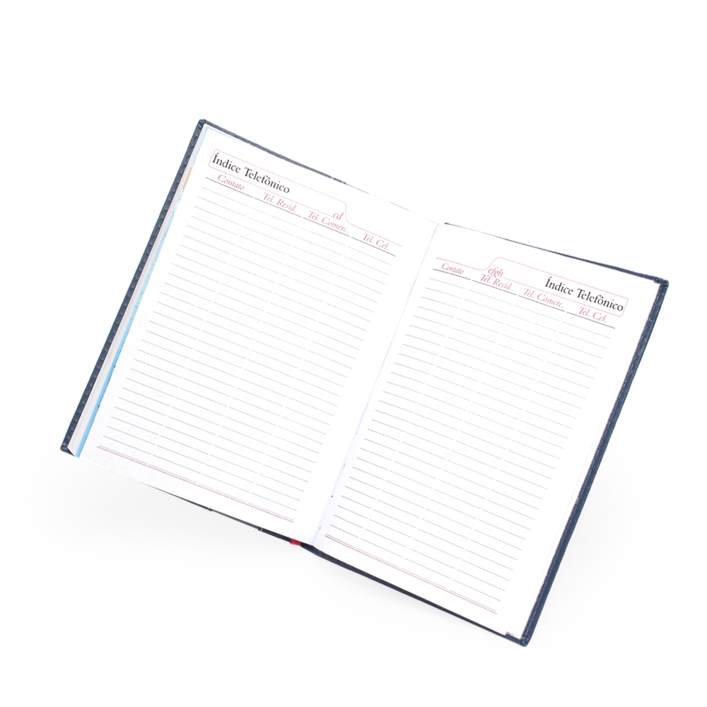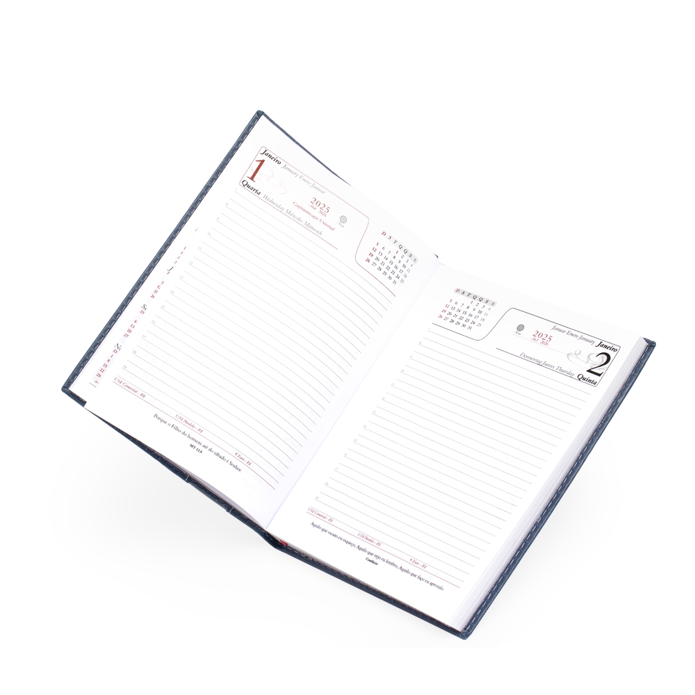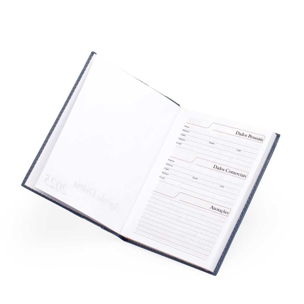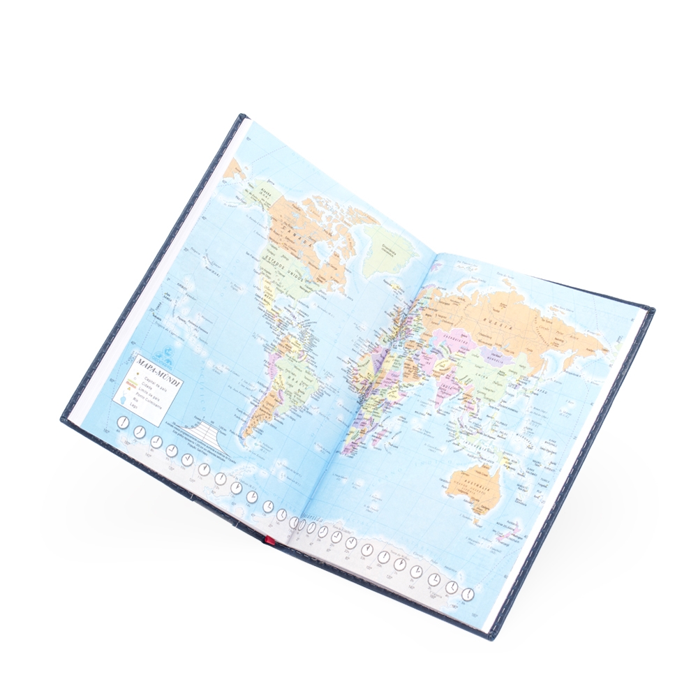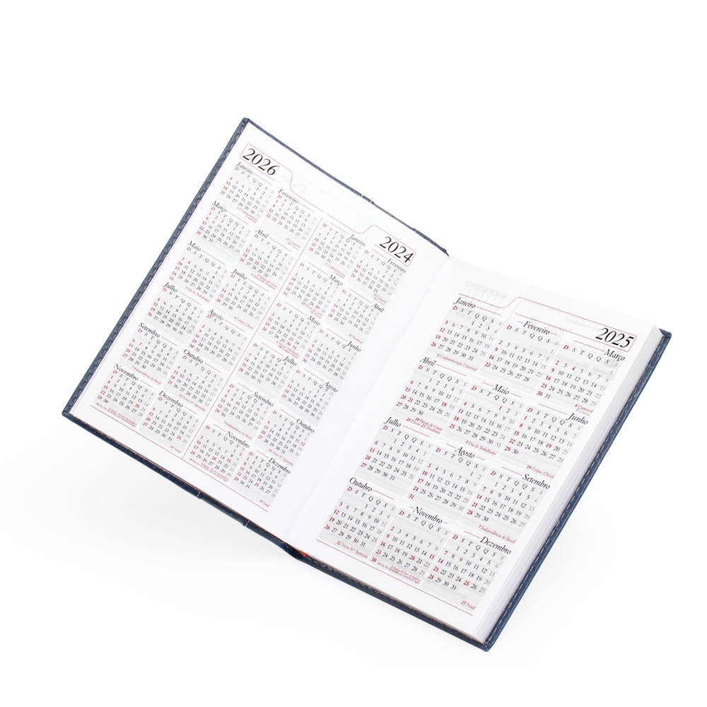 Agenda diária 2026 de couro sintético com suporte para caneta. Contém fita de cetim, marca-página, dados pessoais, calendário de 2026, mapa do Brasil, mapa-múndi, índice telefônico e planejamento.