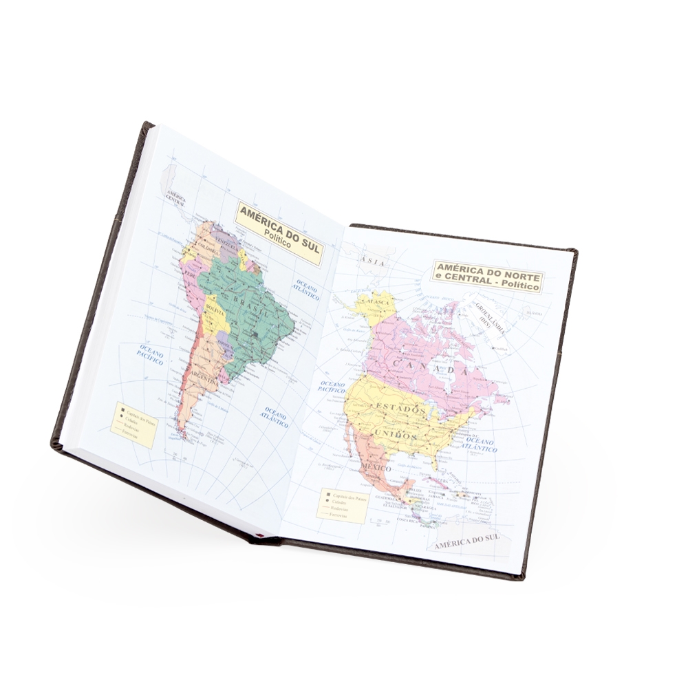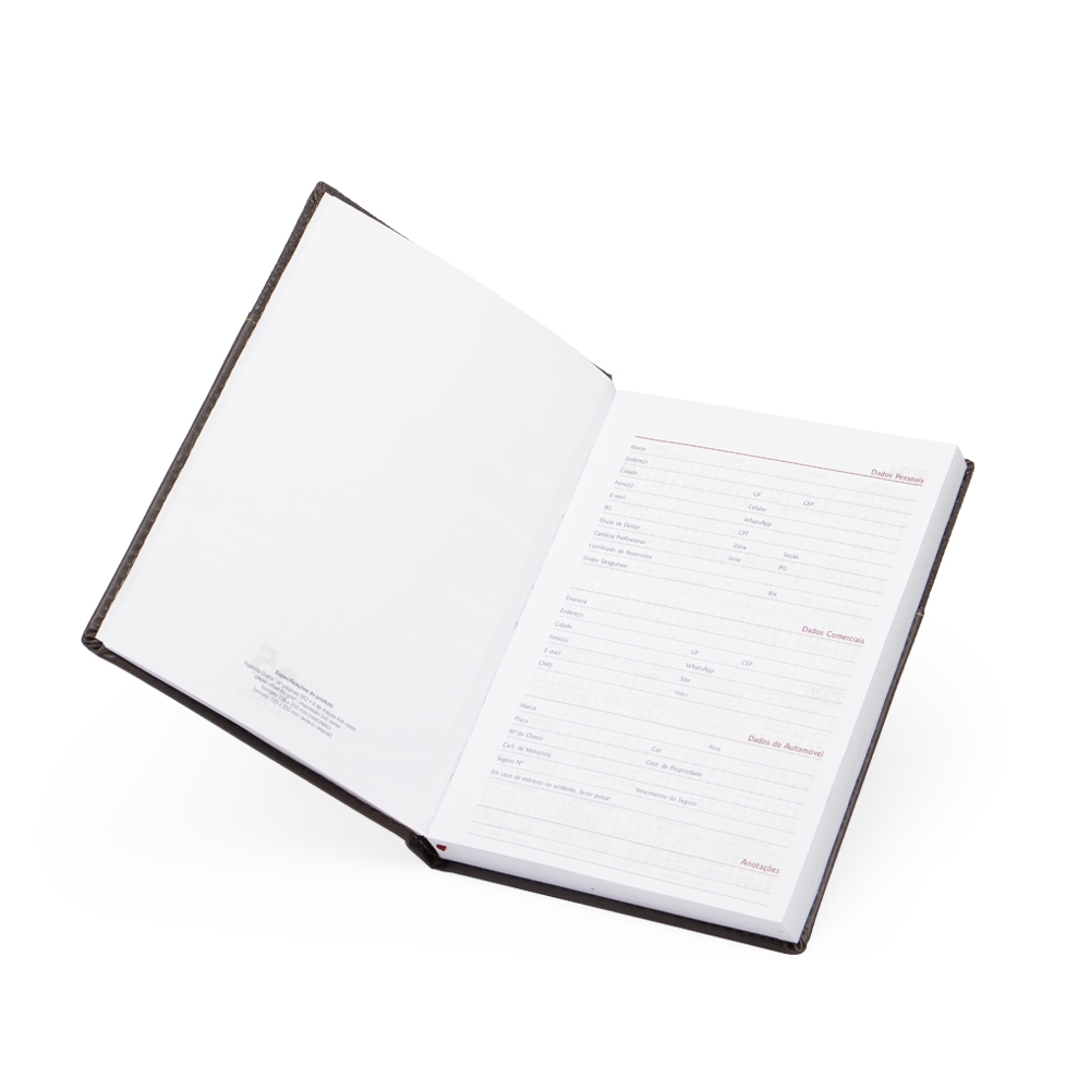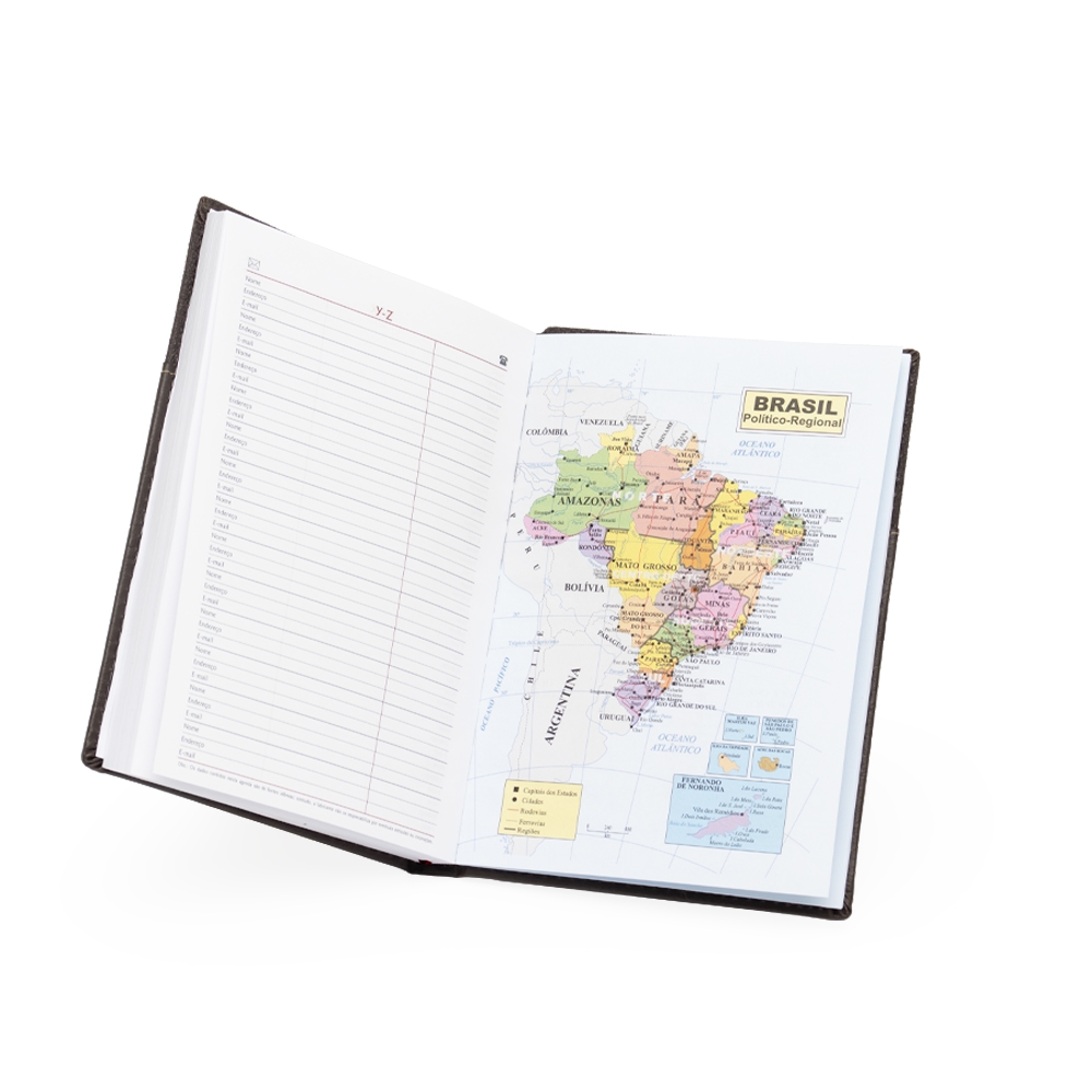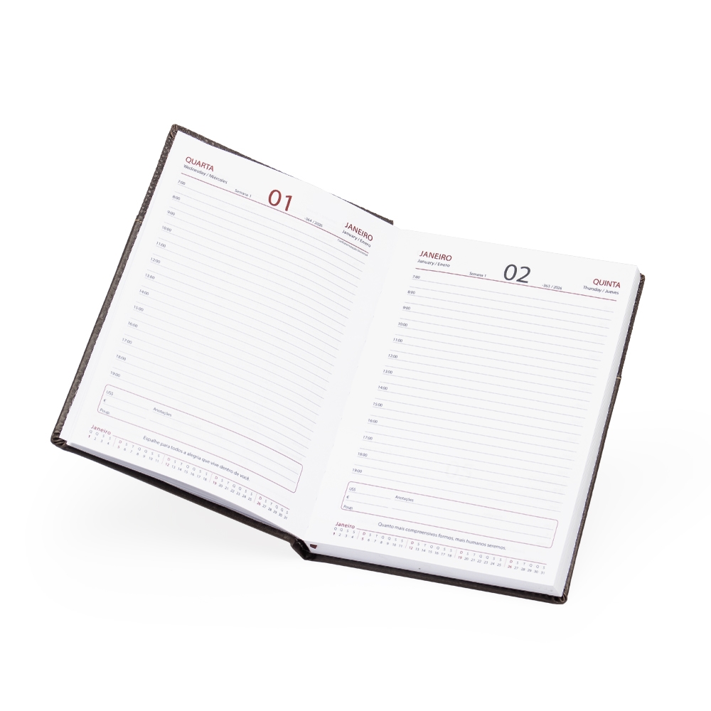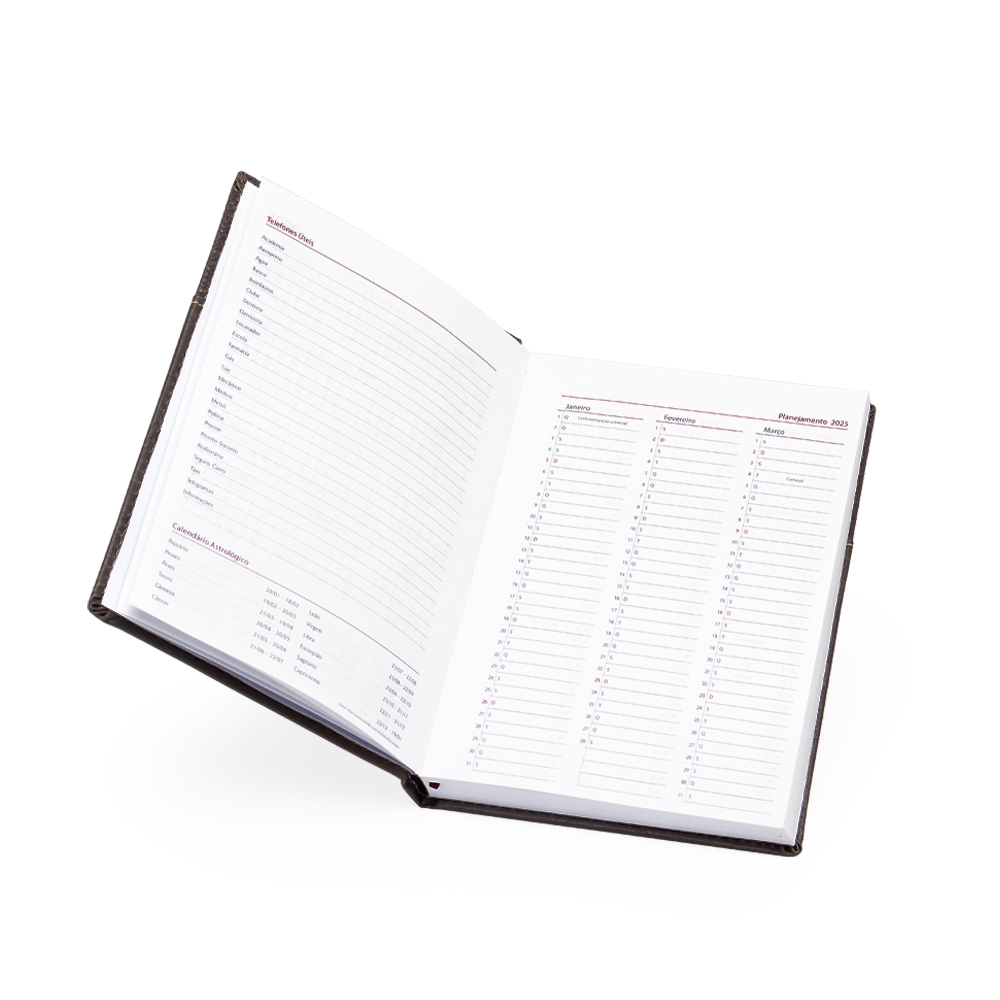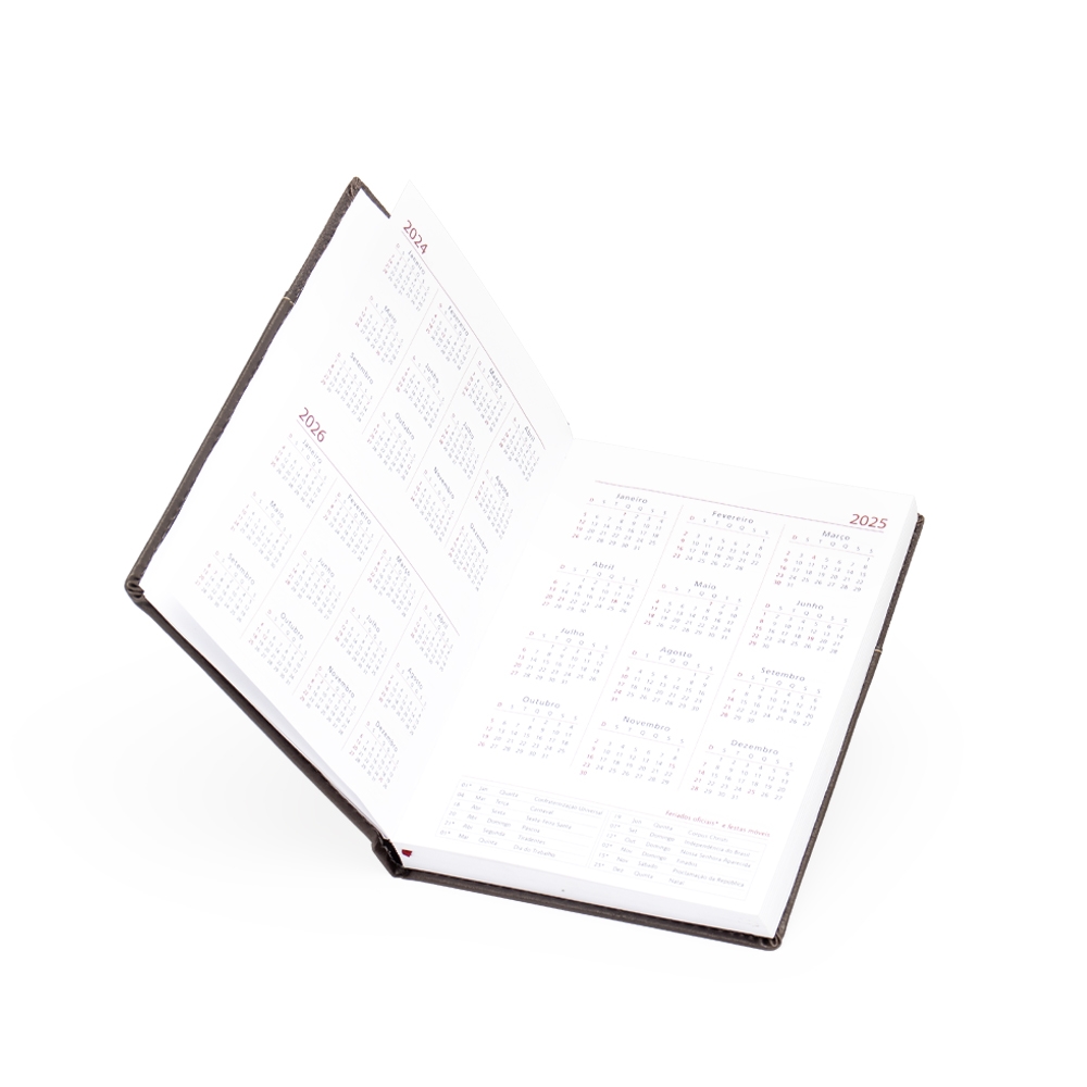 Agenda diária 2025 de couro sintético com porta acessório. Contém fita de cetim marca página, dados pessoais, calendário de 2024 à 2026, mapas, telefone Úteis e planejamento.