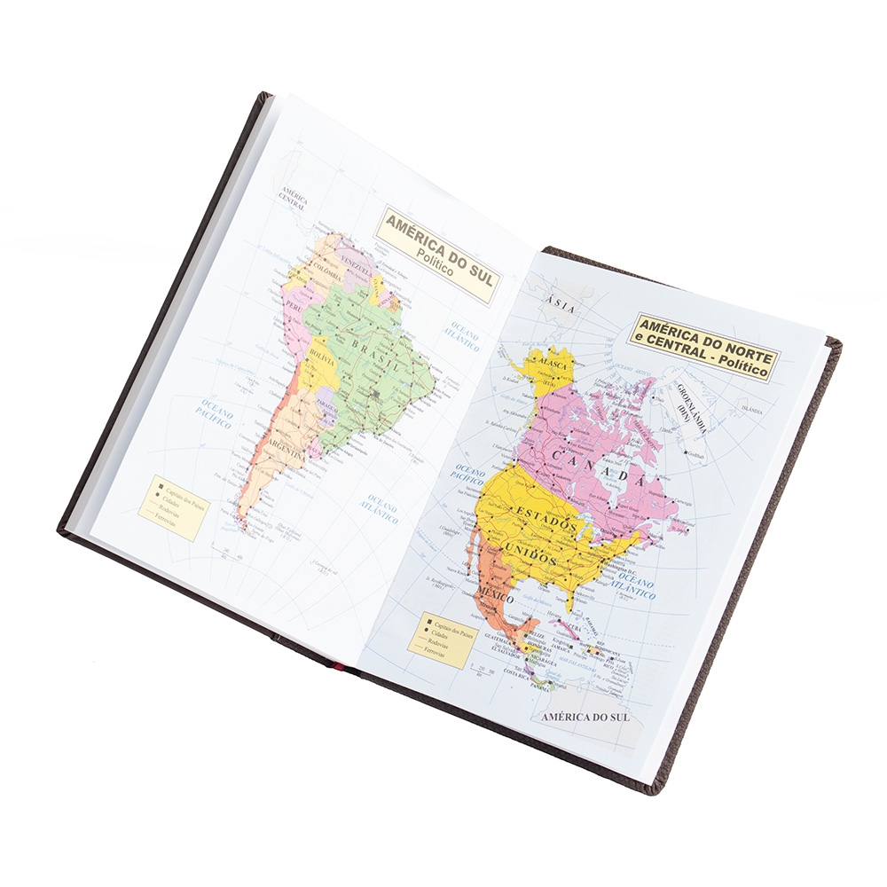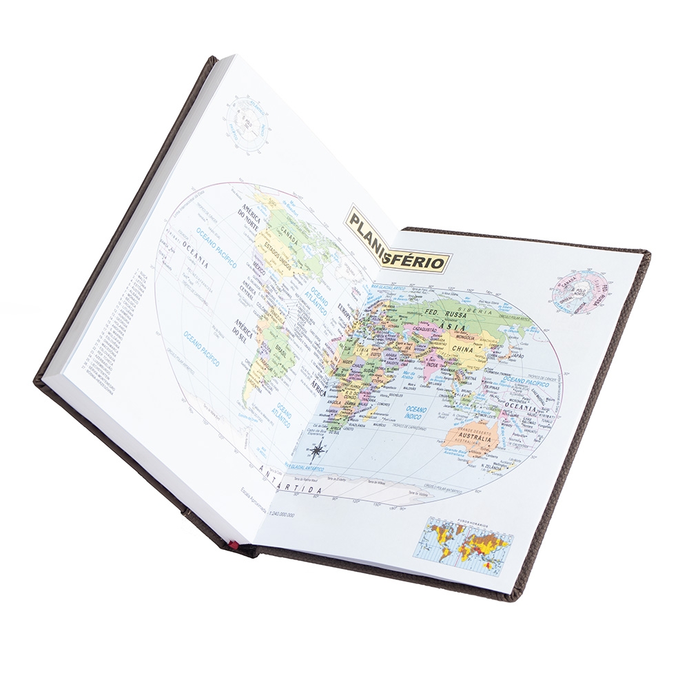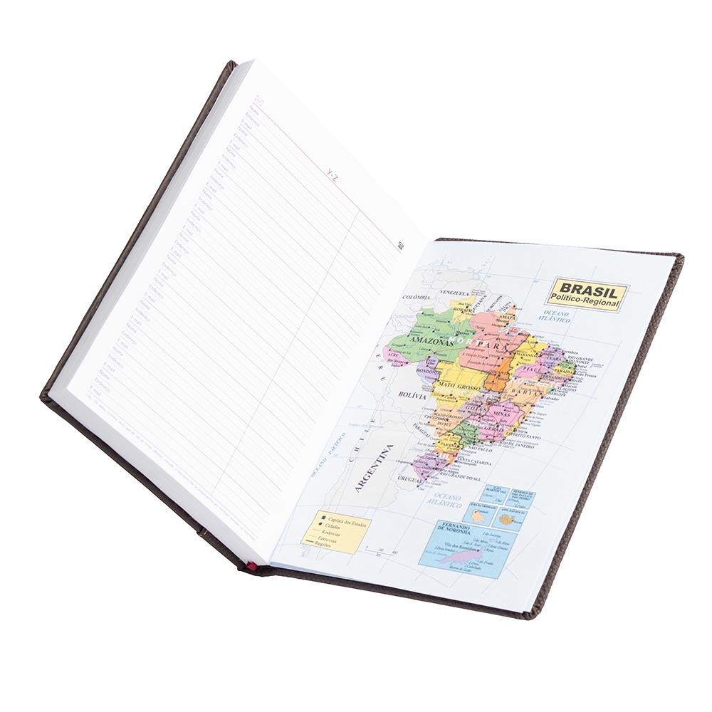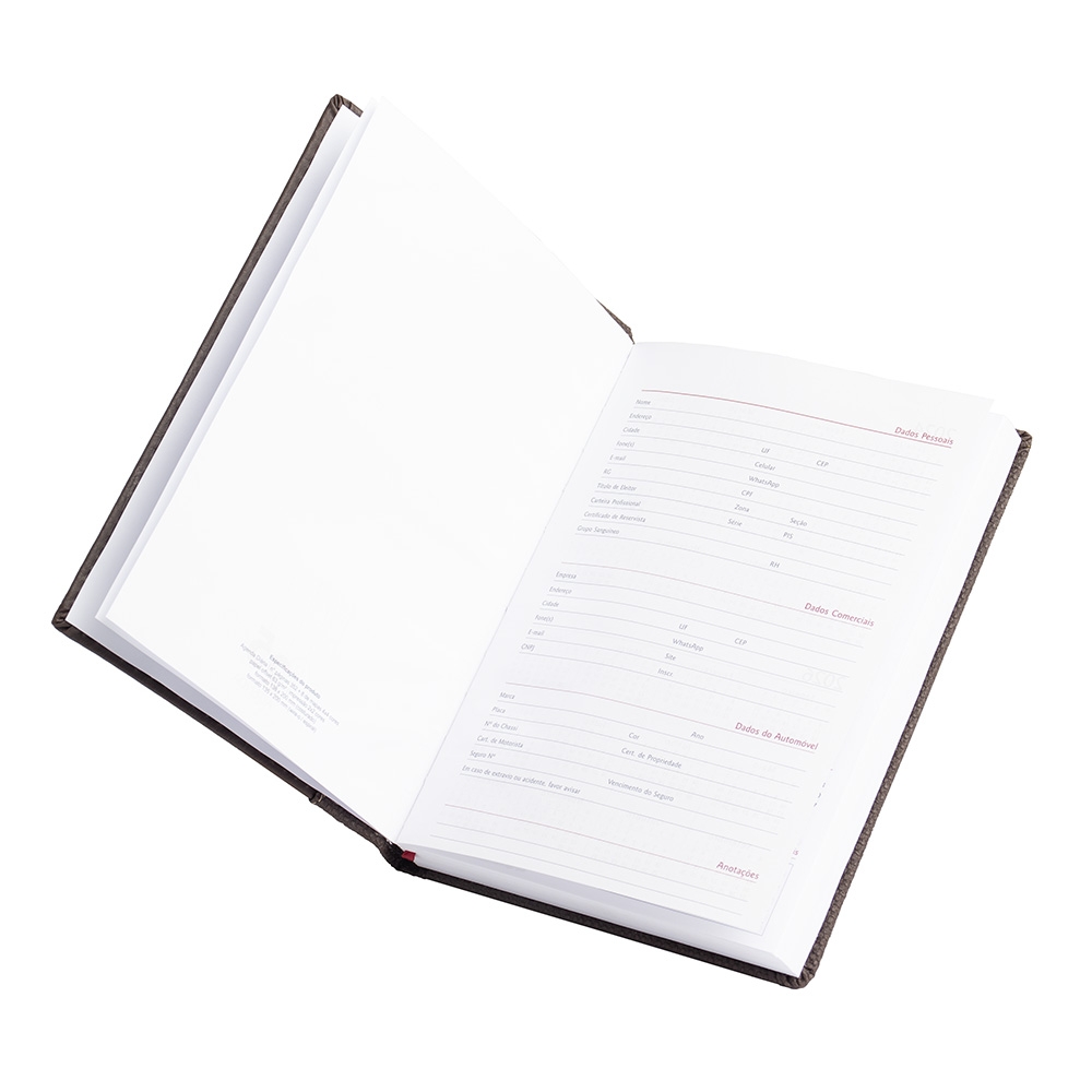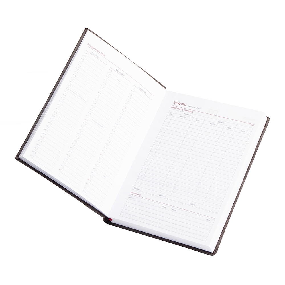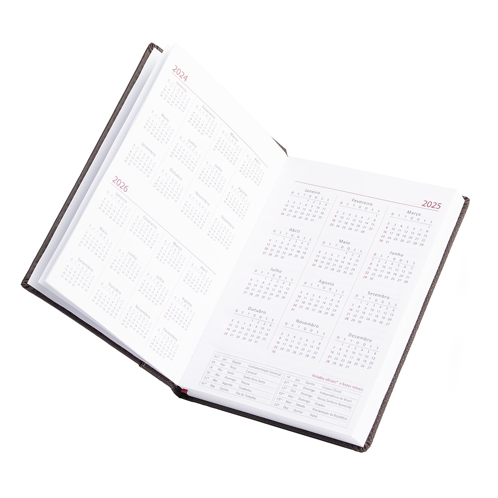 Agenda diária 2025 de couro sintético, contém fita de cetim marca página, dados pessoais, calendário de 2024 à 2026, telefone úteis, planejamento, agenda telefônica e mapas.