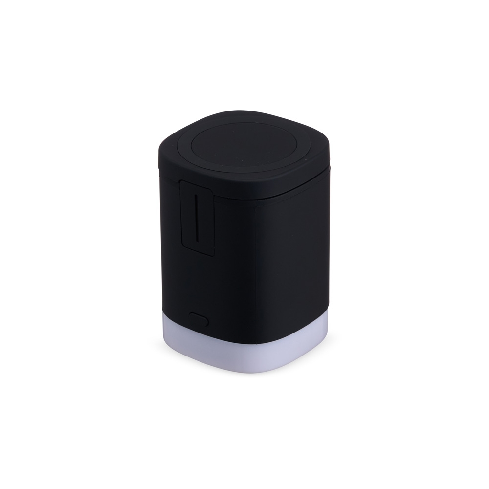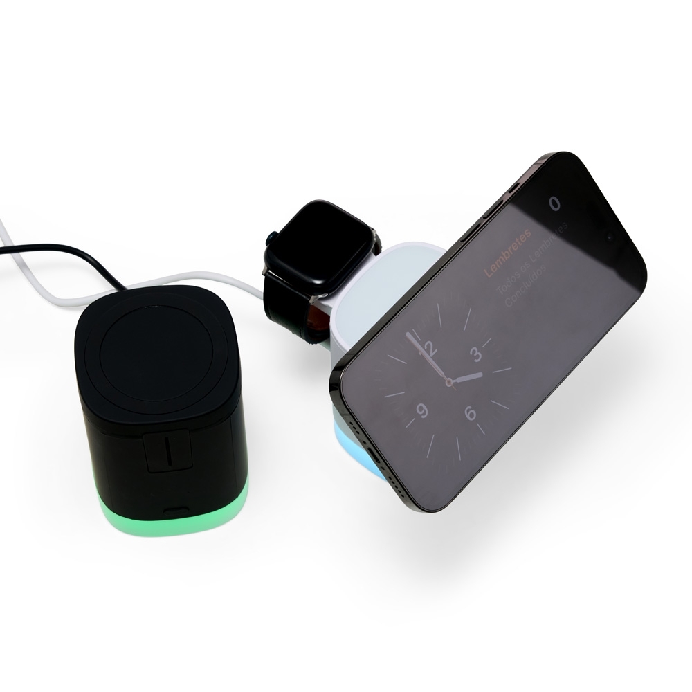 Carregador 3 em 1? A nossa base de carregamento é diferenciada, já que possui indução para relógio, fones e celular, e você pode usá-los todos ao mesmo tempo, basta que o celular e demais dispositivos tenham a tecnologia QI. O LED RGB possui 2 modos, luz branca e vermelho, verde e azul se alternando. A base não armazena energia, portanto, precisa estar conectada ao cabo tipo-C que a acompanha.