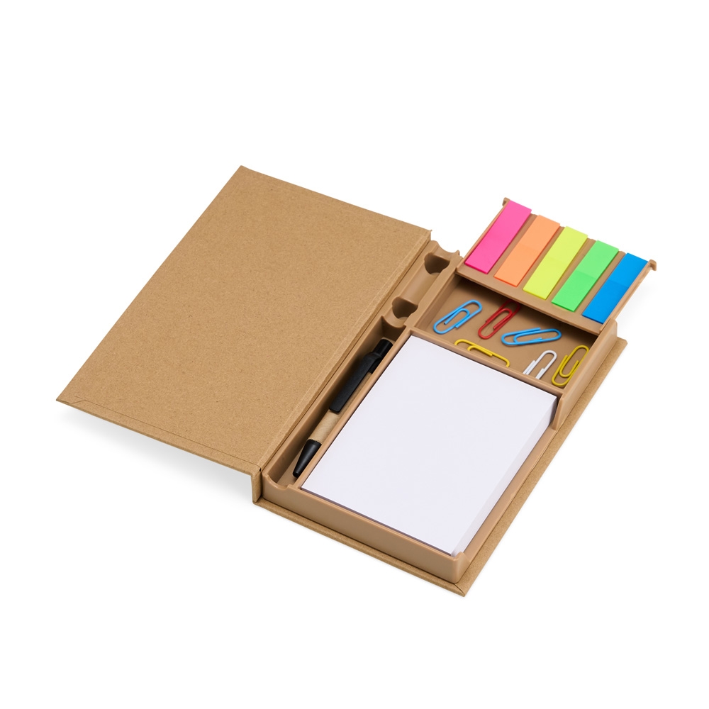 Tudo em seu lugar, prontinho para as anotações! Nosso Bloco de Anotações Ecológico é perfeito para manter a organização enquanto se registra ideias. Feito de material kraft, ele vem com 100 folhas brancas para anotações, 5 marcadores autoadesivos coloridos para destacar o que é importante, 7 clips guardados em uma gavetinha prática e uma mini caneta de papelão com carga esferográfica azul. E ainda conta com espaço para armazenar a caneta e dois suportes porta-caneta, garantindo praticidade no dia a dia. Este bloco é tudo o que o seu cliente precisa para dias repletos de anotações.