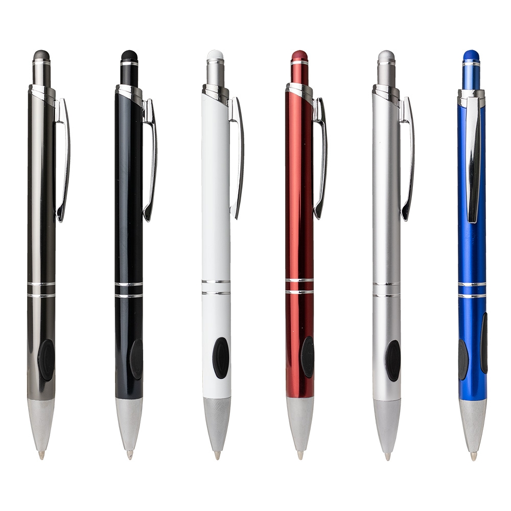 Caneta metálica com touchscreen, com detalhe emborrachado na parte inferior, carga esferográfica azul de 1.0 mm e acionamento por clique.