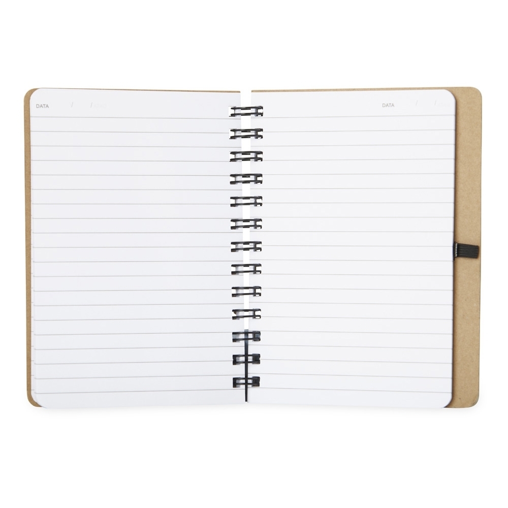 Caderno capa dura em kraft com wire-o e porta caneta. Contém aproximadamente 100 páginas pautadas na cor branca.
