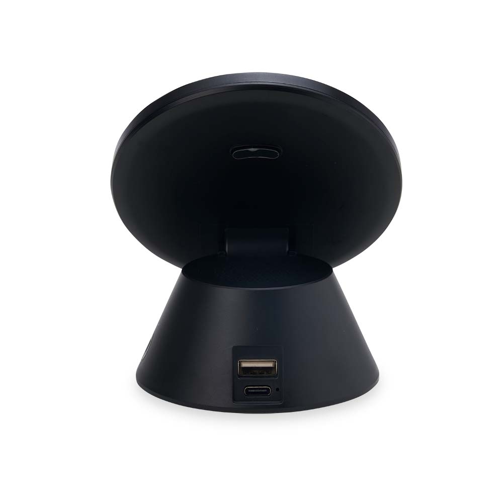 OBS.: Funciona exclusivamente conectado a uma fonte de energia, tanto a caixa de som quanto o carregador via indução. Não possui bateria para armazenamento de carga.