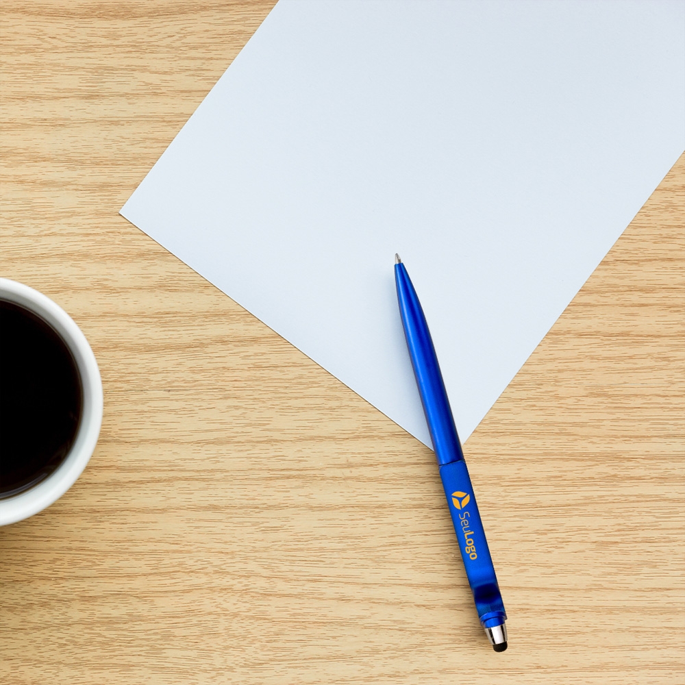 Caneta plástica com suporte para celular e touch screen. Carga esferográfica azul 1.0 mm e acionamento por rotação.