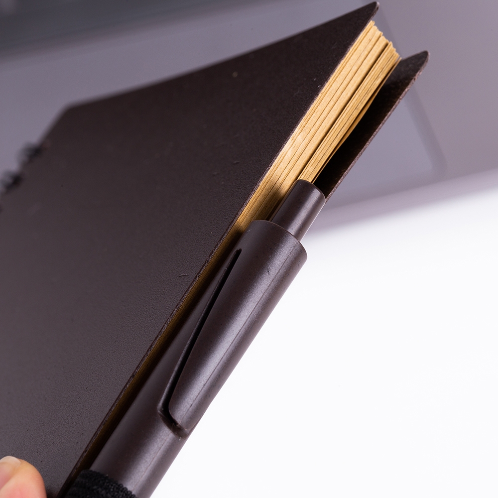 Caderno ecológico com caneta plástica: bloco de anotações com elástico e suporte para caneta, produzido com grãos de café e polipropileno, aproximadamente 70 folhas com pauta, caneta plástica com acionamento por clique.