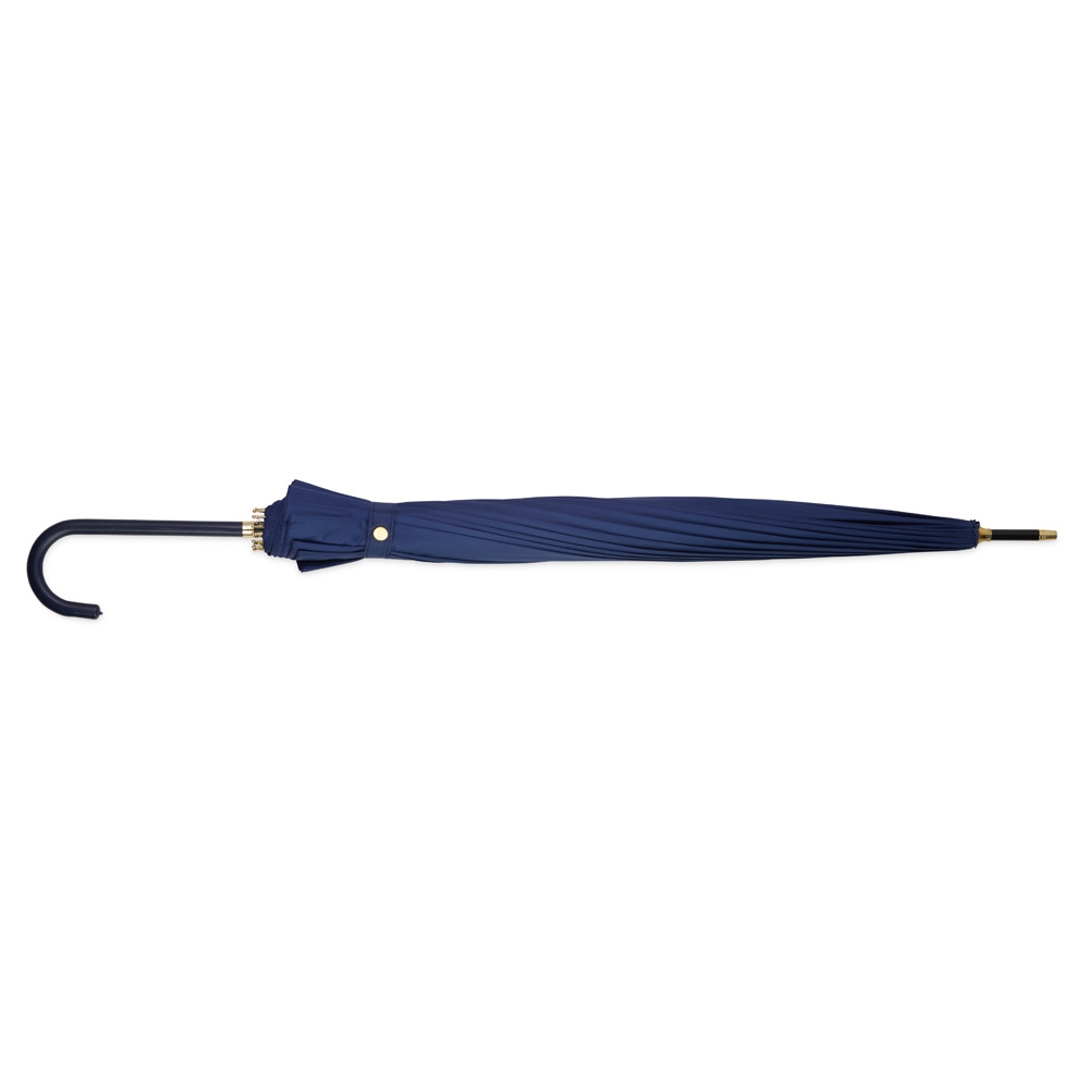 Guarda-chuva de poliéster com abertura automática, estrutura em aço e 16 varetas em fibra de vidro. Possui pegador em couro sintético com botão de acionamento.