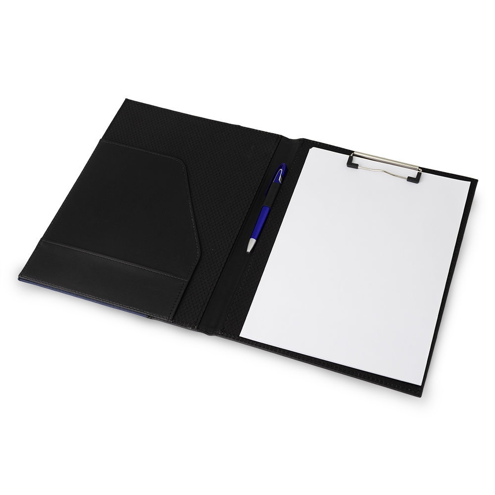 Pasta convenção de couro sintético, possui porta caneta, dois compartimentos, sendo um para arquivar documentos e um bloco com aproximadamente 15 folhas brancas não pautadas.