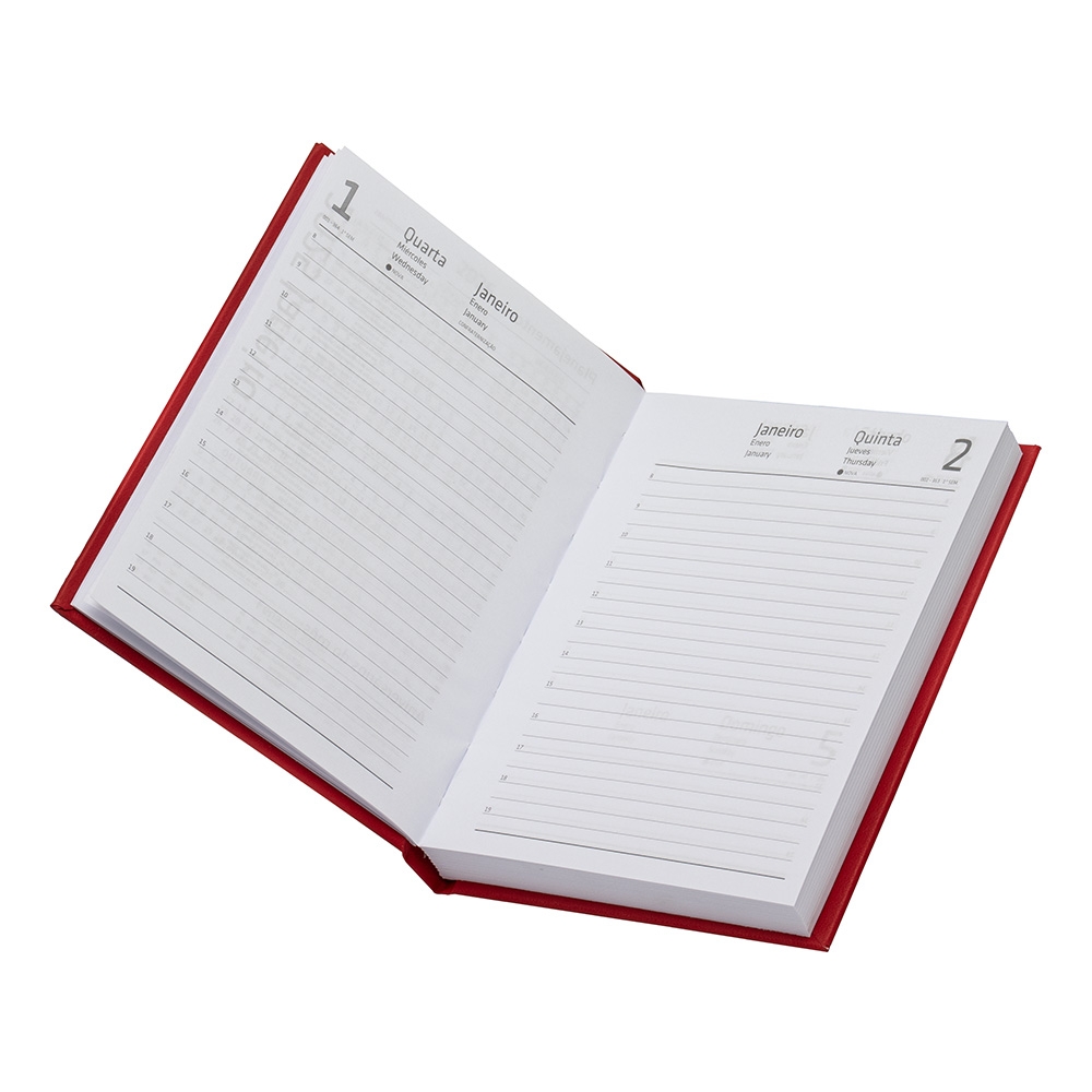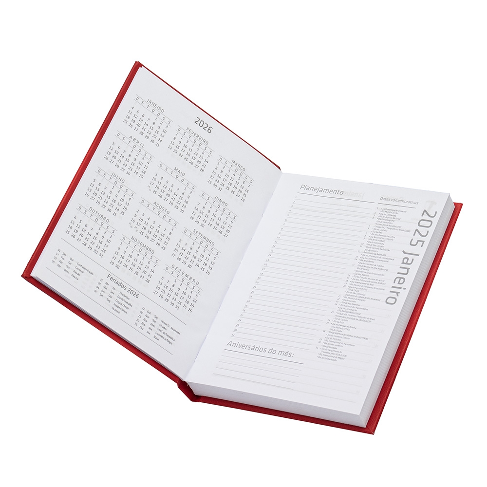 Agenda 2025 com capa em cromato, contém páginas para dados pessoais, calendários de 2024 à 2026 e planejamento.