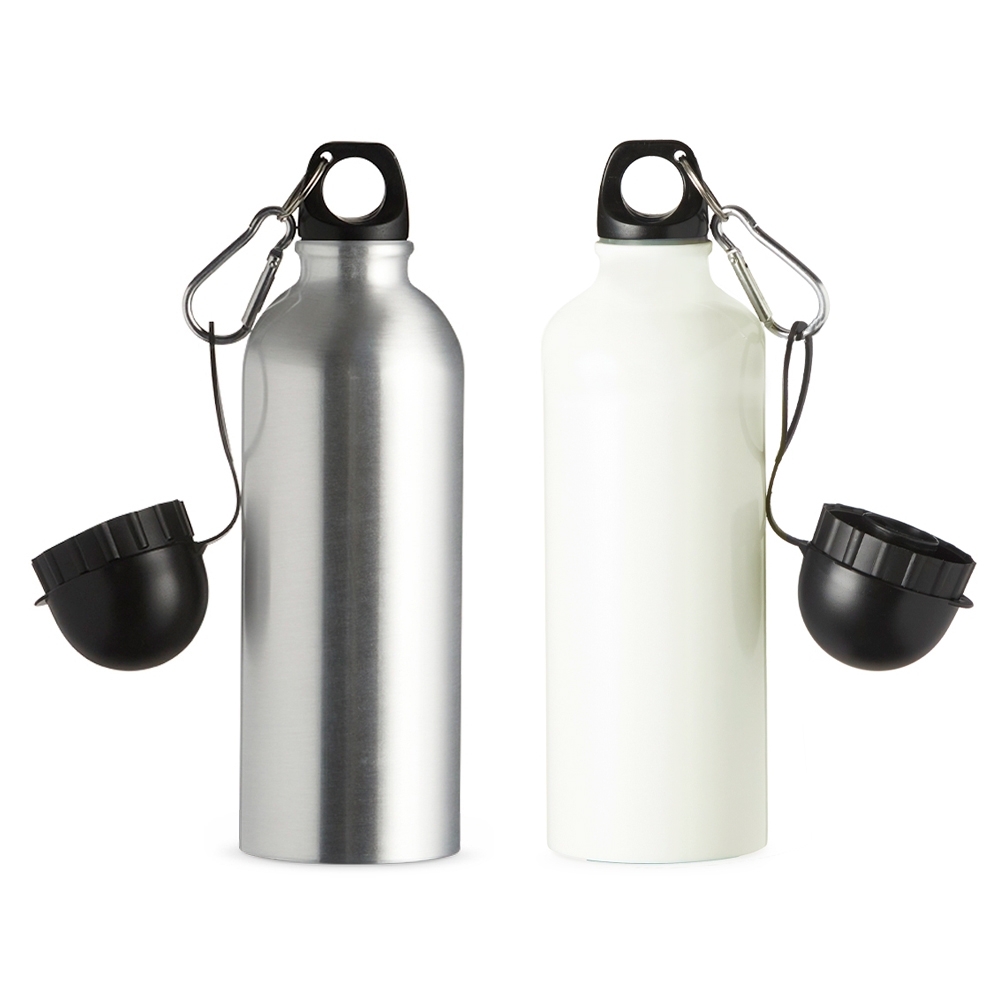 Squeeze 500ml de alumínio com acabamento para sublimação, tampa rosqueável e acompanha um segundo bico com mosquetão (não é térmico).