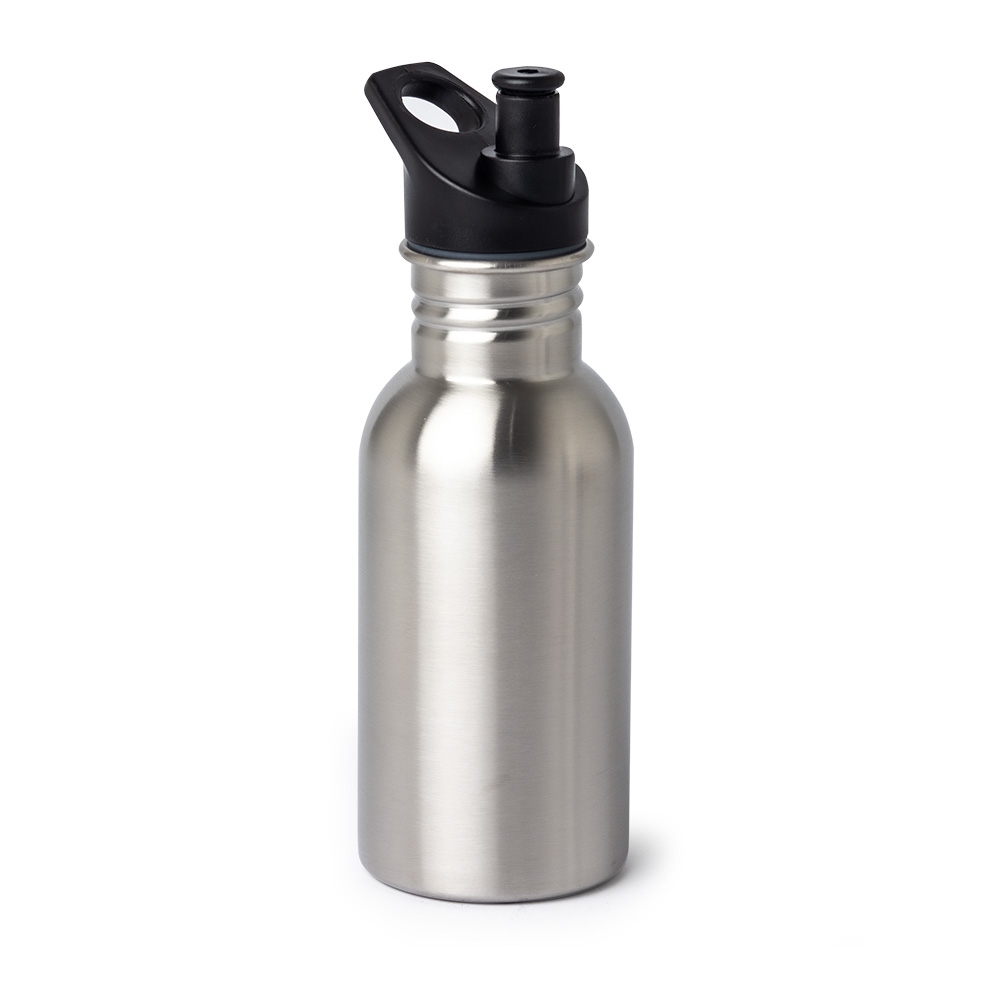 Squeeze inox com capacidade 550ml. Possui tampa rosqueável com bico plástico e alça integrada.
