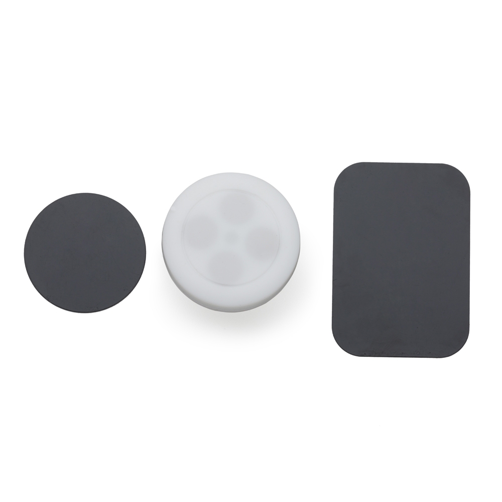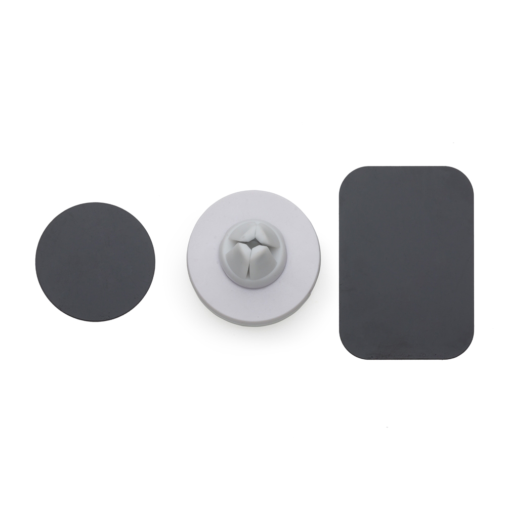 Suporte veicular magnético com quatro imãs de alta imantação e garra de encaixe. Acompanha duas fichas metálicas.
